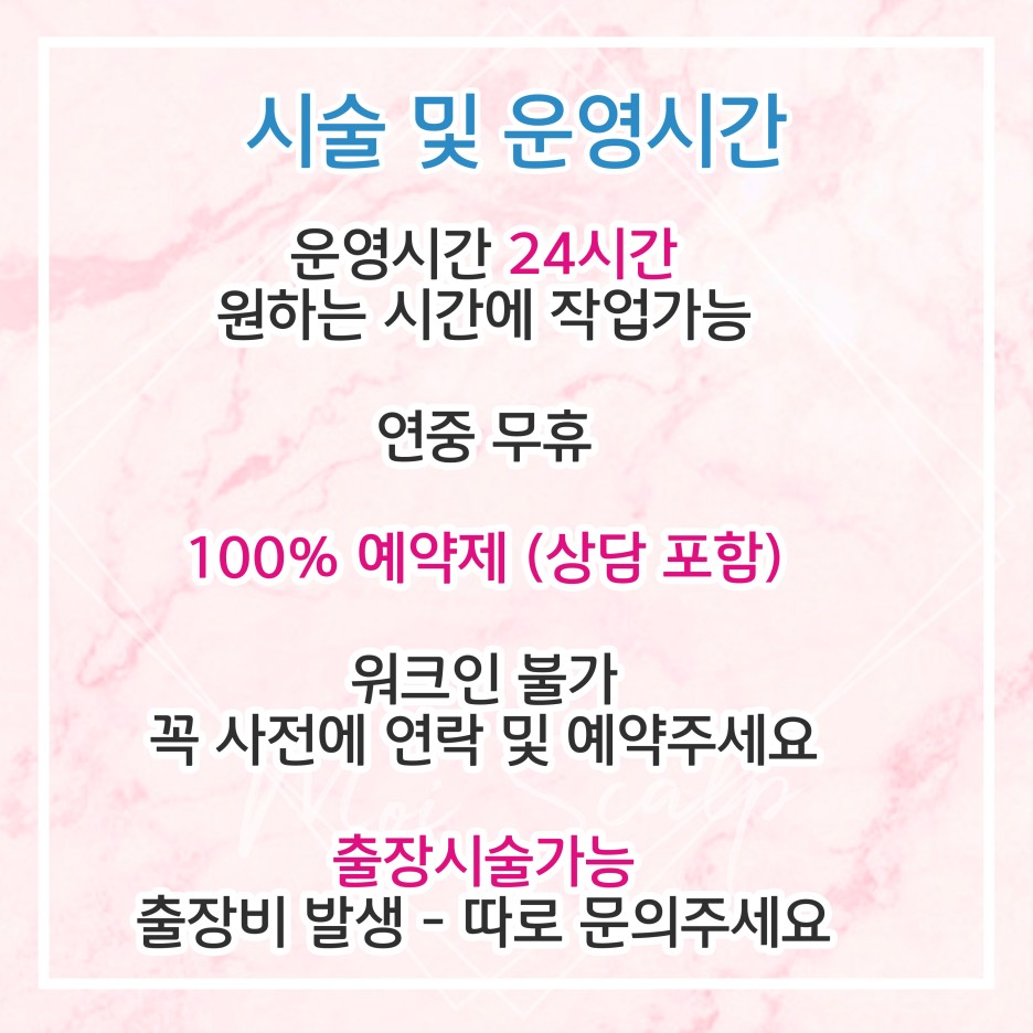 시술은 365일 24시간 가능하지만, 문자/카톡 시간은 시간은 밤 9시까지 입니다.